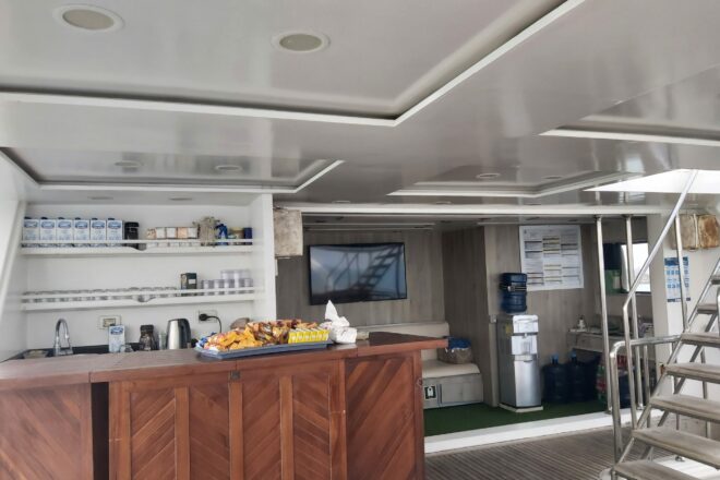 Der klimatisierte Salon für die Mahlzeiten befindet sich im Unterdeck. Auf dem Hauptdeck bietet ein großer überdachter Aufenthaltsbereich im Freien genügend Platz für Entspannung zwischen den Tauchgängen. Eine Bar, mit Kaffee, Tee und Keksen, sowie ein Kühlschrank mit Softdrinks macht den Gang nach unten ins Restaurant überflüssig. Auch die Briefings werden hier gehalten und es steht ein Bildschirm für Präsentationen zur Verfügung. Weitere, teils überdachte, Liegemöglichkeiten bietet das Sonnendeck.