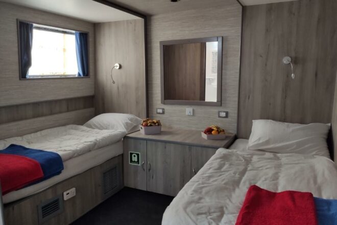 Das Safariboot bietet in 6 Kabinen auf dem Haupt- und 4 Kabinen auf dem Oberdeck, insgesamt ausreichend Platz für 20 Gäste. Alle Kabine haben eine Klimaanlage, genügend Stauraum, ein großes Fenster und natürlich ein eigenes Bad mit Dusche und WC.