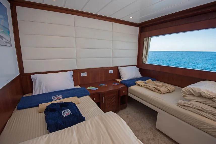 Das Safariboot bietet insgesamt 7 Twin Kabinen auf dem Unterdeck (eine davon kann mit 3 Personen belegt werden), 1 Suite mit Doppelbett auf dem Hauptdeck und je 2 Twin und 2 Doppelbett Kabinen auf dem Oberdeck. Alle Kabine haben eine Klimaanlage, genügend Stauraum und natürlich ein eigenes Bad mit Dusche und WC.