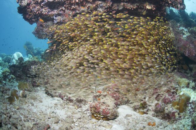 Die Tauchplätze rund um das Maratua Atoll bieten dramatische Steilwände mit einer Vielzahl von Hart- und Weichkorallen, in denen unterschiedlichste Makrolebewesen wie Pygmäenseepferdchen, Schaukelfische, Geisterfetzenfische und farbenfrohe Schnecken zu finden sind. Nur wenige Bootsminuten entfernt liegen die Strömungskanäle des Atolls, wie „Big Fish Country“. Erfahrene Taucher treffen dort auf Großfische wie Riffhaie, Adlerrochen und Barrakudaschulen.