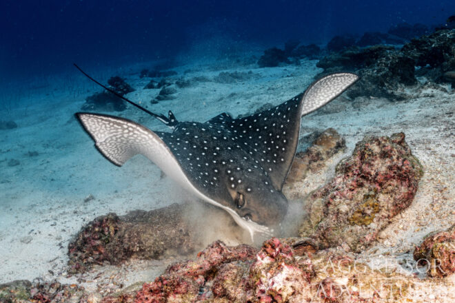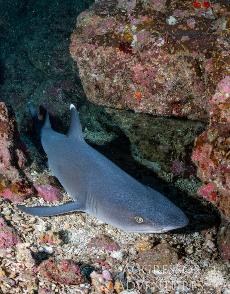 Leider sind die spektakulären Nachttauchgänge zur Zeit ausgesetzt. Bei diesen waren Weißspitzenriffhaie bei der Futteraction zu beobachten. Faszinierend wie sie ihre schlanken Körper in Löcher in den Korallenblöcken reingewunden haben, um den dort übernachtenden Fisch zu verschlingen. Hoffen wir alle, dass Tauchgänge dieser Art bald wieder erlaubt sein werden!
