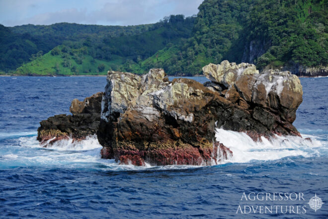 Die Insel ist unglaublich schön und wild. Fährt man zu den Tauchplätzen an ihr vorbei, sieht man steile Klippen, die von tosenden Wellen umspült werden. Schlanke Kokospalmen stehen dicht an dicht, und spektakuläre Wasserfälle tosen die Abhänge herab direkt ins Meer.