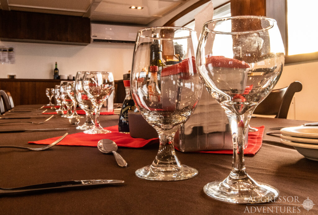 Die Getränkekarte der Aggressor umfasst Fruchtsäfte, Softdrinks, Eiswasser, Eistee, Kaffee und eine begrenzte Auswahl an lokalem Bier und Wein, die im Preis enthalten sind,