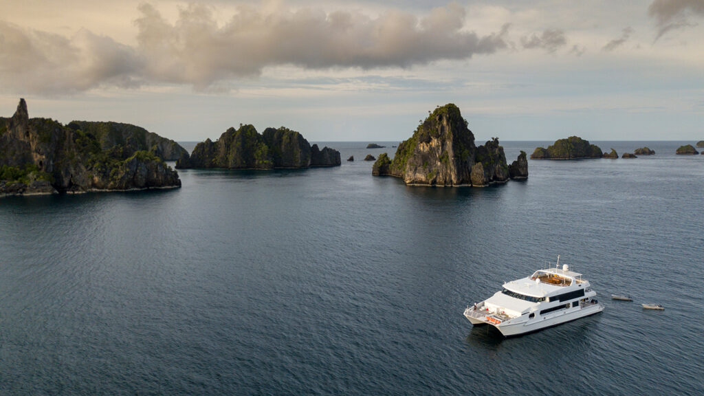 Das Herzstück des Katamarans ist die große Lounge auf dem Hauptdeck, mit Essbereich, Bar, Selbstbedienungstheke und einer Sofa Ecke. Hier findest du zu jeder Tageszeit etwas für Zwischendurch, Tee, einen Kaffeevollautomaten sowie gekühlte Softdrinks. Der Heckbereich wird vom Tauchdeck eingenommen. Eine Outdoor Lounge mit der zweiten Bar auf dem Oberdeck lädt Dich zum Chillen ein. Wie bei allen Schiffen der Solitude Flotte gibt es auch hier hervorragende Arbeitsplätze für Fotografen, der Raum befindet sich auf dem Oberdeck.