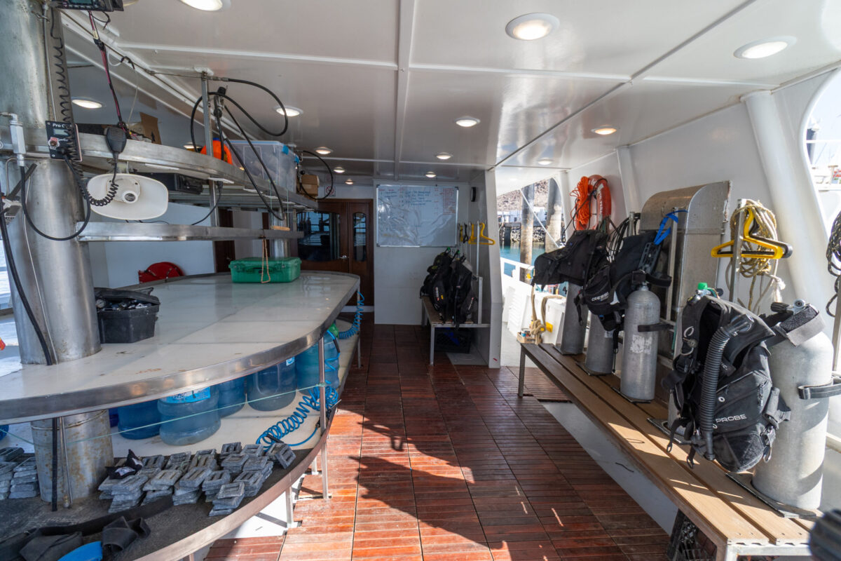 Das geräumige Tauchdeck befindet sich auf dem Hauptdeck. Hier hat jeder von den 20 Tauchern ausreichend Platz für sein Equipment. Für Fotografen steht ein großer Kameratisch mit ausreichend Stromanschlüssen zur Verfügung. In 3 Gruppen eingeteilt, werden die Taucher von einem erfahrenen Guide begleitet. Die Tauchgänge werden von einem der zwei Zodiaks durchgeführt, die mit einer stabilen Leiter ausgestattet sind und so die Ausstiege aus dem Wasser erleichtern.