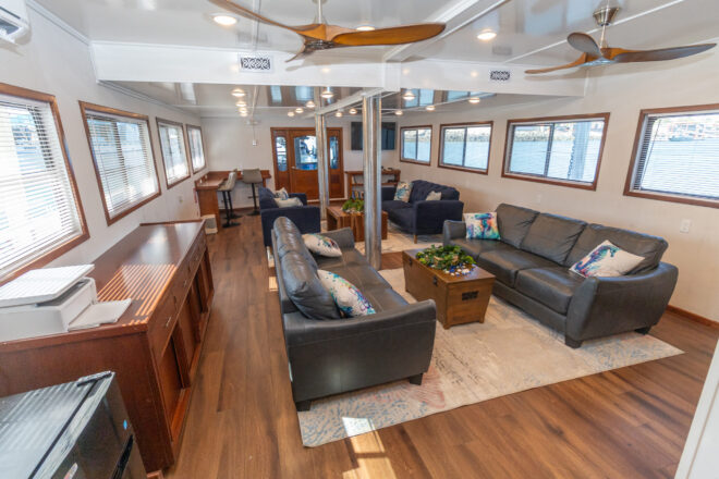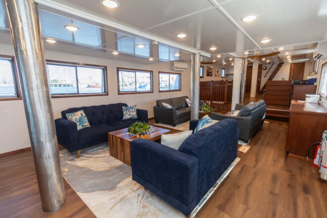 Auf dem Hauptdeck befindet sich der große und gemütliche Salon mit Unterhaltungseinrichtungen sowie der Speisesaal mit angeschlossener Bordküche. Das große Tauchdeck mit voll ausgestattetem Kameratisch befindet sich ebenfalls auf dem Hauptdeck und ist mit 2 Frischwasserduschen bestückt. Herrlich entspannen kann man auf dem Oberdeck im schattigen Terrassenbereich der mit gemütlichen Liegestühlen ausgestattet ist. Am Sonnendeck kann man zwischen den Tauchgängen gemütlich chillen und relaxen.