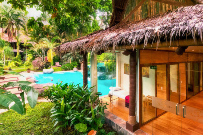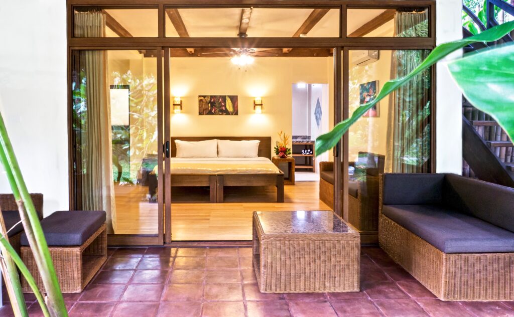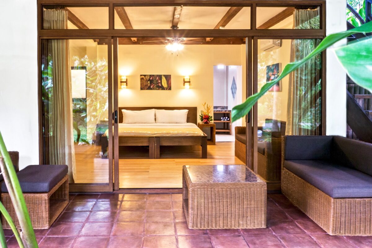 Insgesamt 45 Gästezimmer verteilen sich auf die tropischen Gartenanlagen rund um den 100m2 großen chlorfreien Süßwasserpool, der mit Sonnenliegen bestückt ist. Ein jeder Bereich ist liebevoll gestaltet und integriert sich harmonisch in die natürliche Umgebung. Baden lässt es sich auch wunderbar am direkt angrenzenden Lavastrand, wo sich auch Restaurant und Bar mit überdachter Terrasse befinden, sodass die Gäste beim Essen den unverbauten Blick aufs Meer genießen können.