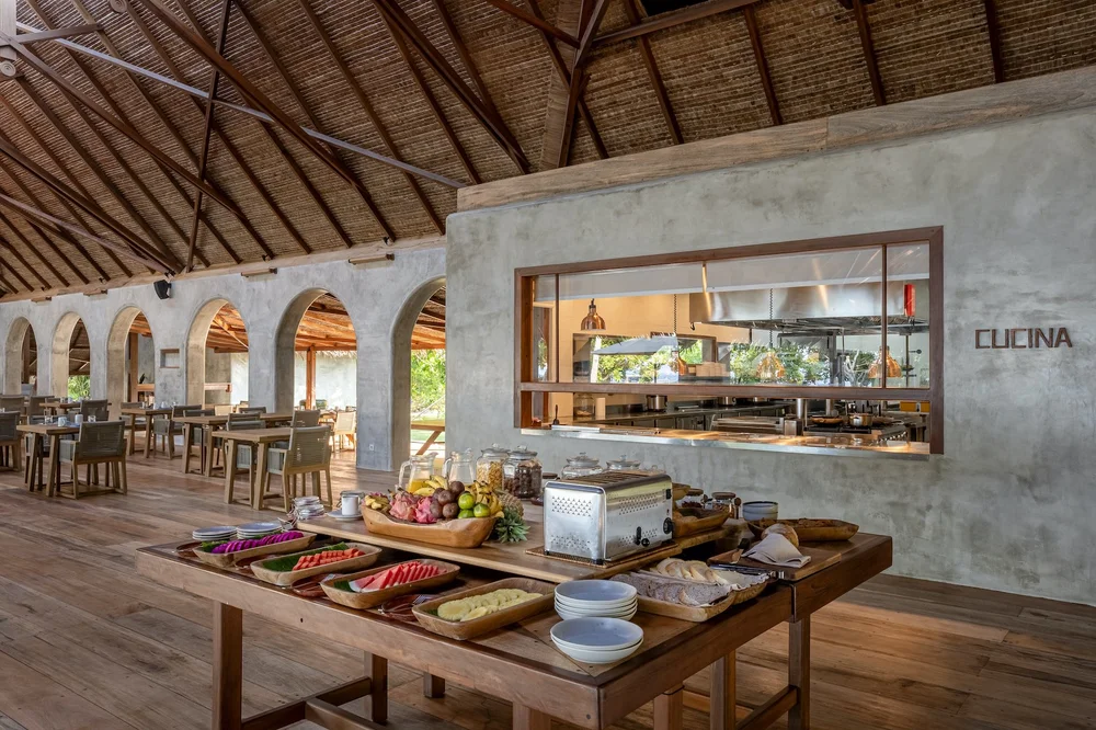 Vollpension ist im Preis inklusive und wird am neuen Strandrestaurant direkt neben dem Pool serviert. Sie beinhaltet drei Mahlzeiten pro Tag und einen Snack am Nachmittag. Wasser, Tee, Kaffee und Kekse werden den ganzen Tag über angeboten. Unter der italienischen Resortleitung ist der Espresso Mokka nach jeder Mahlzeit obligatorisch.