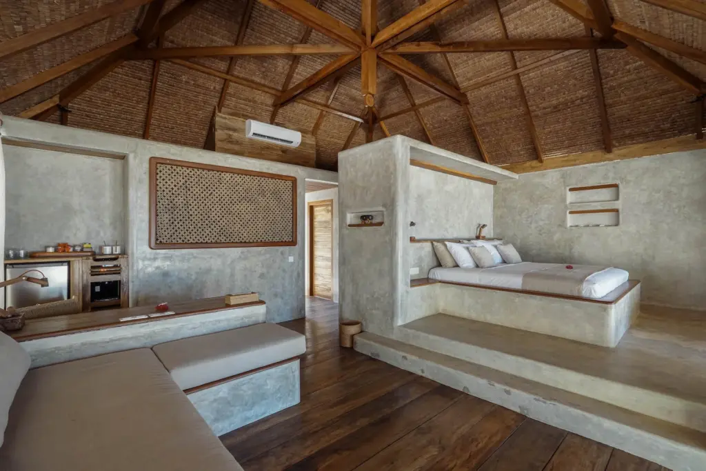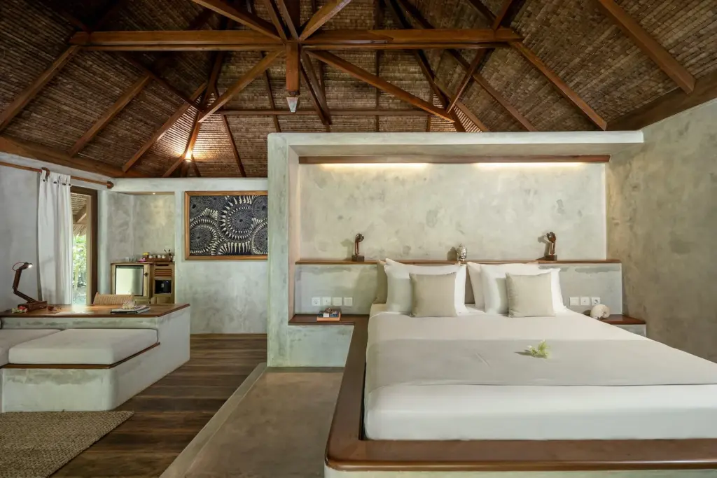 Die 100m² großen freistehenden Villen liegen direkt am Strand – Ausblick aufs Meer inklusive. Auch die Beach View Villen sind mit einem Kingsize-Bett mit hochwertiger Matratze und hochwertiger Bettwäsche ausgestattet. Ein zusätzliches Sofa kann als weitere Schlafgelegenheit genutzt werden. Im angrenzenden Open Air Badezimmer genießt man eine besondere Atmosphäre mit Innen- und Außenduschen mit Warmwasser.