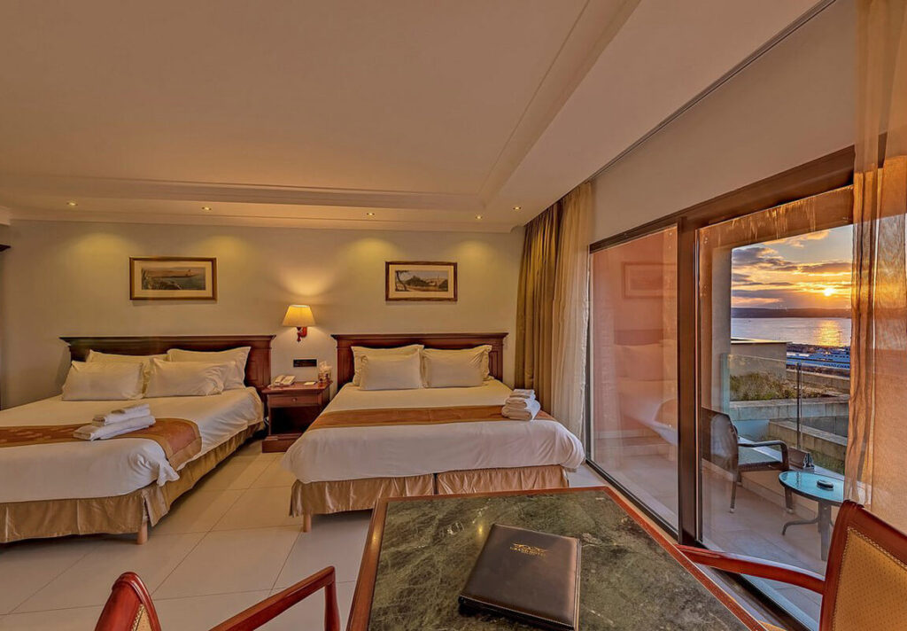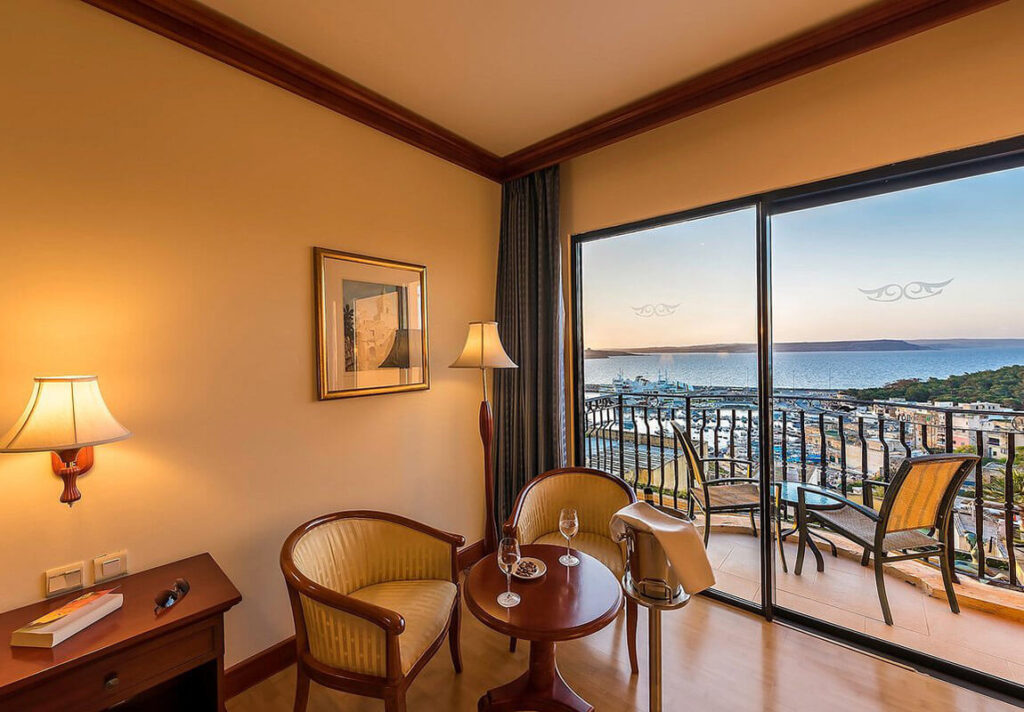 Die Zimmer im Grand Hotel Gozo sind komfortabel und freundlich eingerichtet und bieten dir je nach Kategorie unterschiedlich viel Platz und Ausblick. Du hast die Wahl zwischen günstigeren Zimmern mit Land- oder Country View sowie Zimmern mit seitlichem oder direktem Meerblick. Besonders beliebt sind die Zimmer mit Balkon oder Terrasse, von denen aus du den Blick auf den Hafen von Mgarr, Comino und Malta genießen kannst.