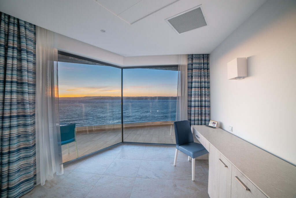 Für mehr Platz und zusätzlichen Komfort stehen dir verschiedene Suiten zur Verfügung. Diese verfügen über einen separaten Wohnbereich und eignen sich ideal für längere Aufenthalte oder wenn du einfach etwas mehr Raum genießen möchtest. Die Sea View und Panoramic Suiten bieten dir schließlich besonders viel Platz sowie spektakuläre Ausblicke auf das Mittelmeer und die umliegenden Inseln – perfekt für alle, die sich etwas Besonderes gönnen möchten.