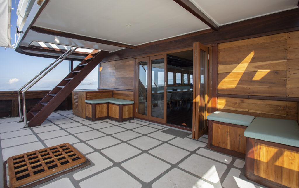 Auf dem Hauptdeck gibt es eine klimatisierte Lounge mit bequemen Sofas. Zur Unterhaltung verfügt das Boot über einen 49-Zoll-Flachbildschirm und eine digitale Film-, Musik- und Büchersammlung sowie Gesellschaftsspiele. Eine Bar und ein geräumiger Essbereich befinden sich ebenfalls auf dem Hauptdeck sowie ein Ladebereich für Kameras.