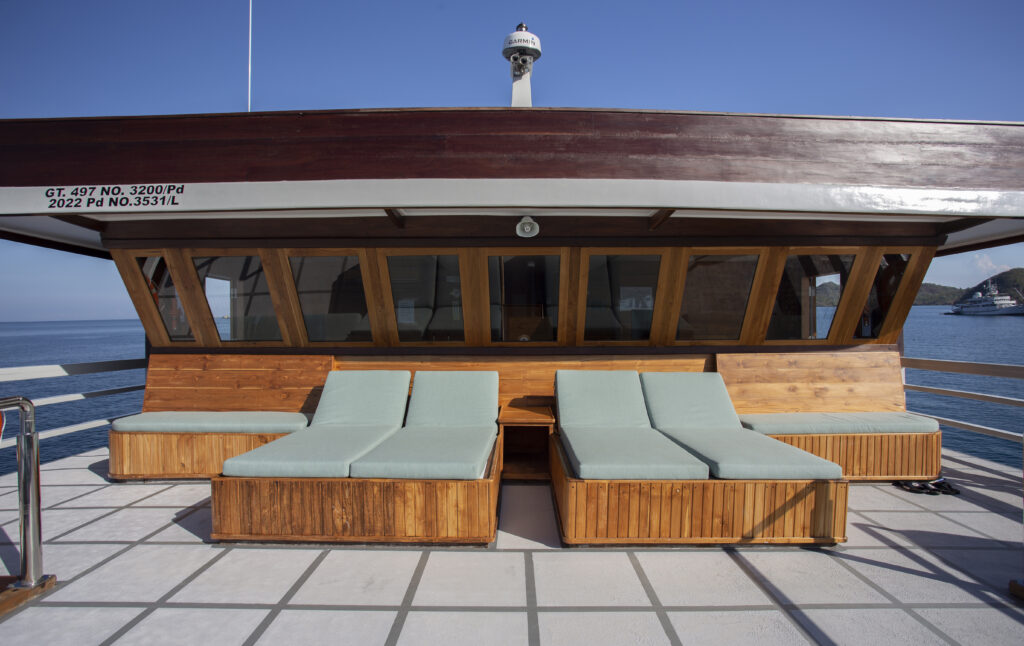 Auf dem Oberdeck befinden sich Sitzgelegenheiten im Freien mit Sitzsäcken und Liegestühlen.