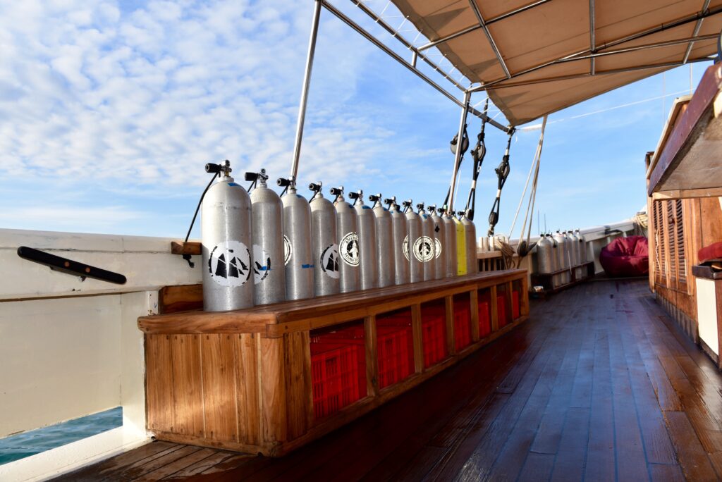 Alle Tauchgänge werden von zwei großen Zodiaks mit Außenbordmotoren durchgeführt, um dich jedes Mal zum perfekten Tauchplatz zu bringen. Gratis Nitrox, zwei Tauchguides und Bojen werden an Bord zur Verfügung gestellt. DIN-Adapter sind ebenfalls verfügbar. Leihausrüstung ist gegen eine Gebühr und nach Reservierung verfügbar. Nachttauchgänge sind möglich. Es werden bis zu drei Tauchgänge pro Tauchtag angeboten.