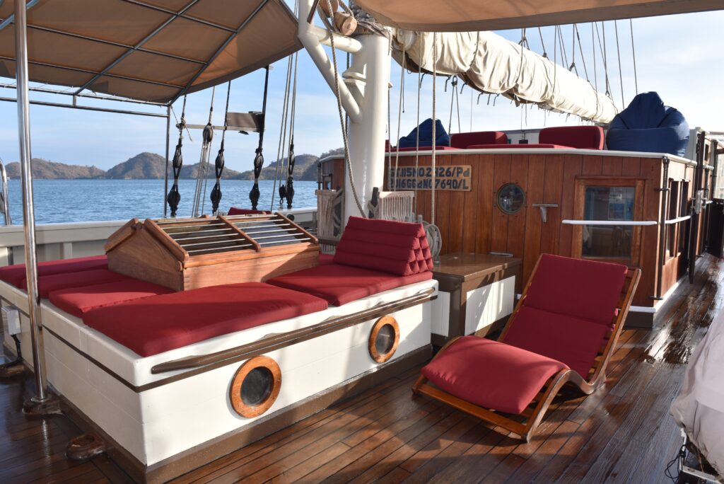 Auf dem Unterdeck befindet sich ein kleiner, gemütlicher, klimatisierter Aufenthaltsraum mit TV, DVD, Musikanlage und Minibar. Die Mahlzeiten können entweder im überdachten Essbereich auf dem Hauptdeck oder auf dem Oberdeck im Freien eingenommen werden, wo es ausreichend Schatten gibt, um bequem zu speisen. Die meiste Zeit verbringt man auf dem Oberdeck in einem der vielen bequemen Entspannungsbereiche, wo man entweder in der Sonne oder im Schatten liegt und die sich ständig ändernde Aussicht genießt.