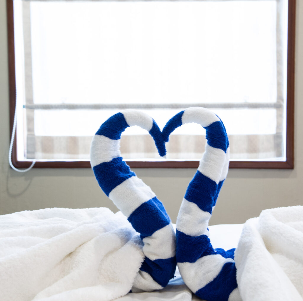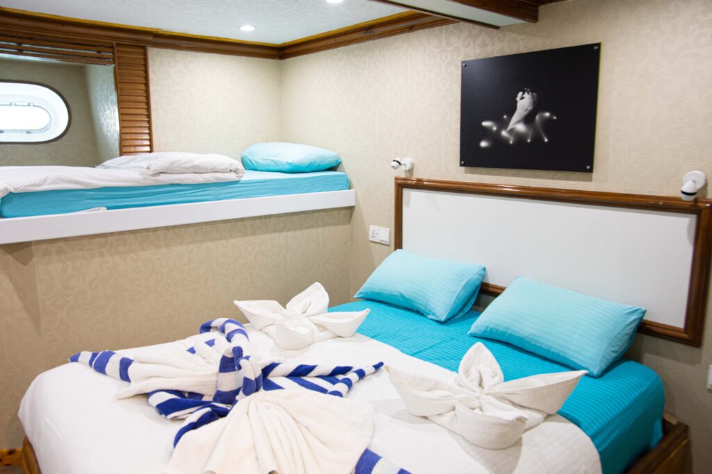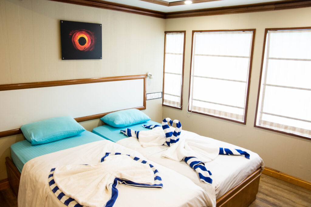 Das Boot verfügt über neun Kabinen, die sich auf allen drei Decks befinden. Sie sind entweder mit Doppelbetten- oder Zweibett-Belegung ausgestattet. Die Kabinen auf dem Oberdeck bieten einen wunderbaren Blick auf das Meer. Alle Kabinen haben ein eigenes Bad und eine regulierbare Klimaanlage.