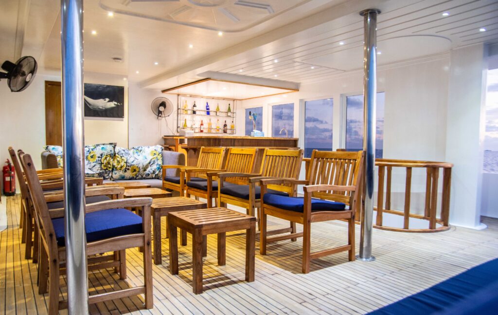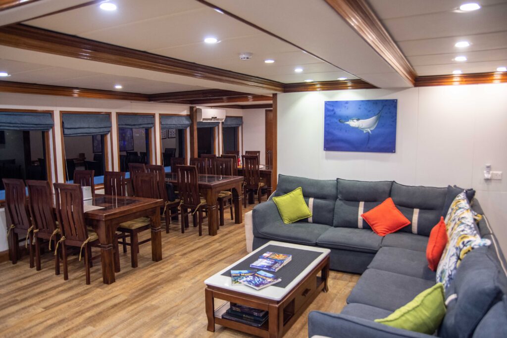 Der geräumige Salon des Schiffes befindet sich auf dem Hauptdeck. Er ist mit bequemen Sofas ausgestattet, auf denen du dich perfekt entspannen kannst. Außerdem kannst du für unterhaltsame Stunden die Bar im Salon der Emperor Virgo nutzen. Auf dem Sonnendeck gibt es viele Liegestühle, um den Sonnenuntergang nach einem erlebnisreichen Tauchtag zu beobachten.