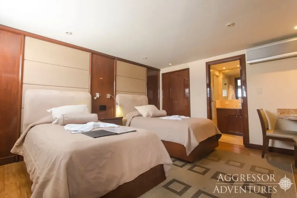 Auf dem Hauptdeck befindet sich die Hauptkabine mit einem Doppelbett und auf dem Oberdeck zwei Suiten, die entweder zwei Einzelbetten oder ein Doppelbett haben. Die Suite-Kabinen sind luxuriöser und verfügen dementsprechend über mehr Platz, große Bullaugen, Monitore mit Mediaplayer, Minibar/Kühlschrank.