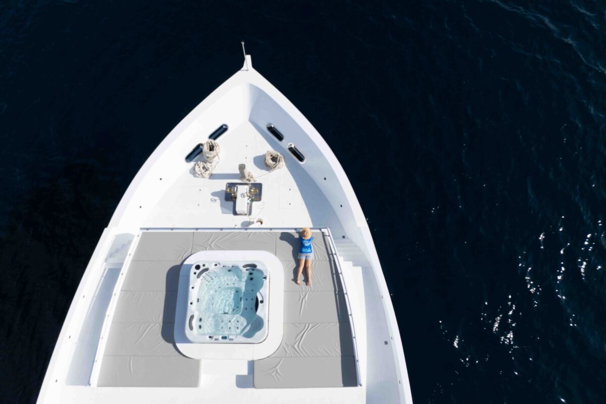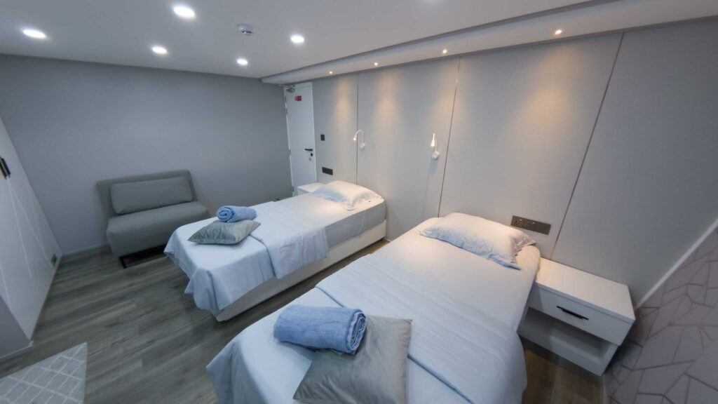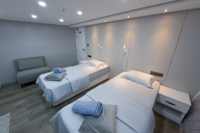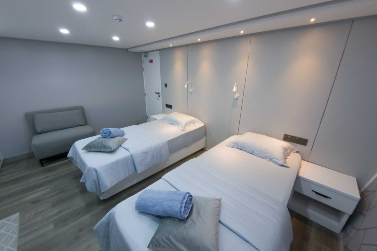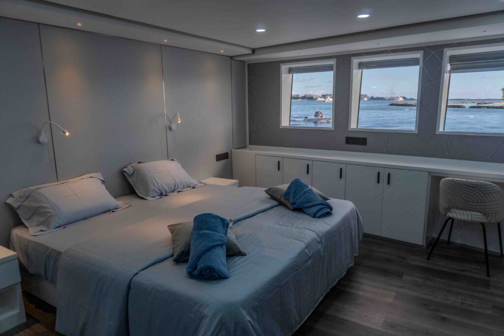 Insgesamt 14 Kabinen verteilen sich auf drei Decks – alle mit eigener Dusche/WC, Klimaanlage, Safe und viel Stauraum. Es gibt sechs Kabinen am Unterdeck mit Doppel-oder Twinbetten.