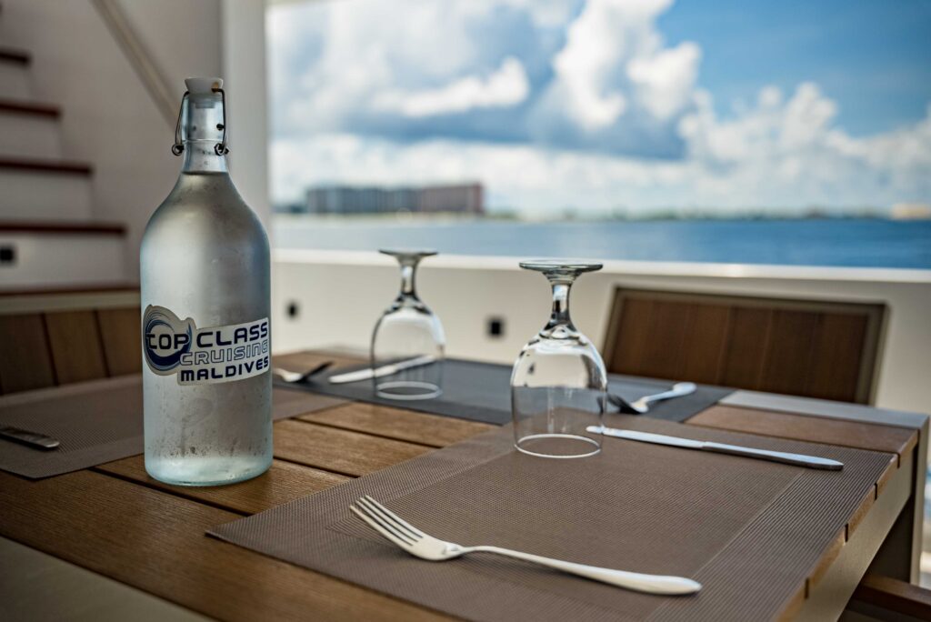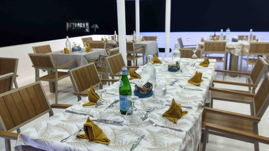Du genießt in der Regel Vollpension mit einer Küche, die europäische Klassiker und maledivische Spezialitäten verbindet. Auf Wunsch werden vegetarische, vegane, glutenfreie und allergikerfreundliche Mahlzeiten zubereitet – um Voranmeldung wird jedoch gebeten. Gespeißt wird im Restaurant oder – wenn das Wetter passt – im Freien am Hauptdeck. An der Cocktail‑ und Weinbar findest du eine Auswahl an feinen Spirituosen und Weinen; ein Willkommensdrink eröffnet die Tauchwoche.