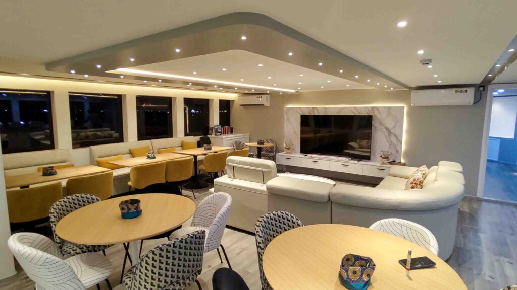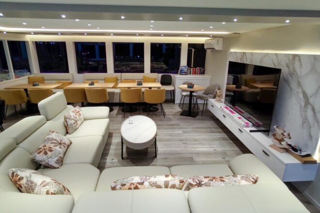 Am Maindeck befinden sich vier Kabinen mit großen Panoramafenster, die aber nicht zu öffnen sind. Auf dem Oberdeck findet man weitere vier Kabinen, etwas kleiner als die Kabinen unter Deck aber auch mit extra großen Fenstern und kurzen Wegen zur Bar oder auf das Sonnendeck.