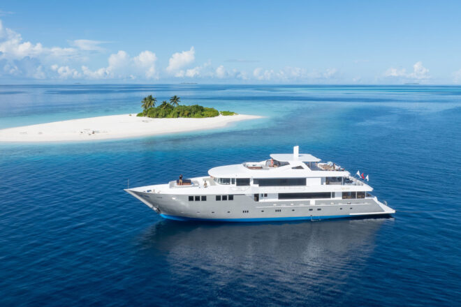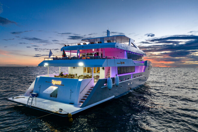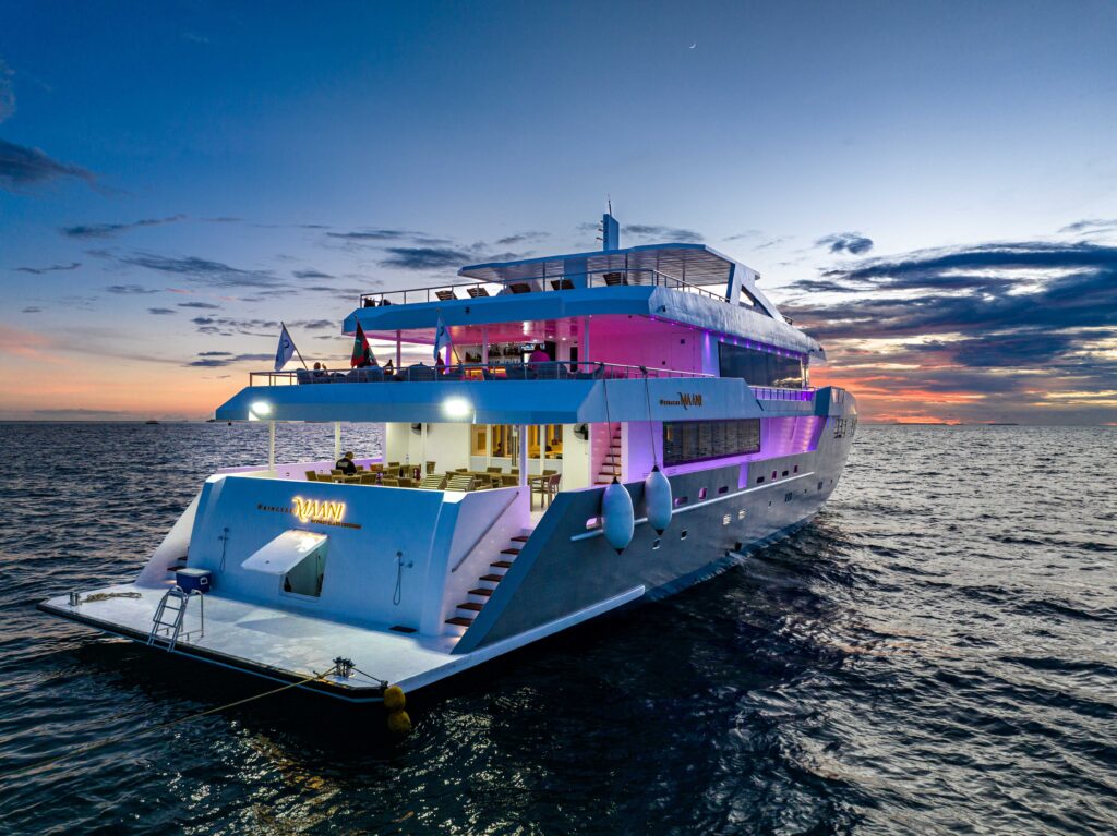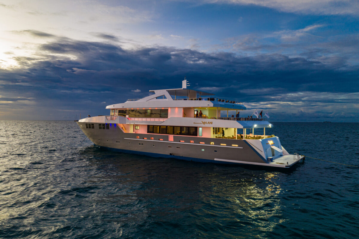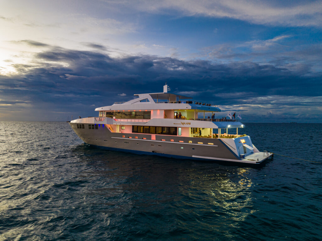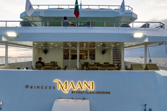 Die Princess Maani von First Class Cruising ist eine 42 Meter lange Malediven-Yacht mit 14 Kabinen für max. 28 Gäste – ideal für komfortable Tauchsafaris von den Zentralatollen bis in den tiefen Süden. An Bord erwarten dich ein großzügiges Sonnendeck mit zwei Whirlpools, klimatisierte Innenbereiche und ein großes Tauch-Dhoni für reibungslose Tauchabläufe.
