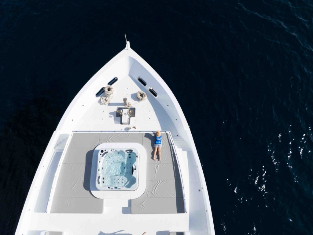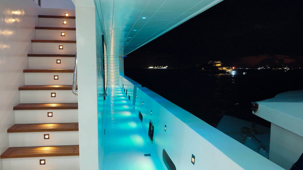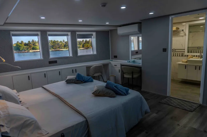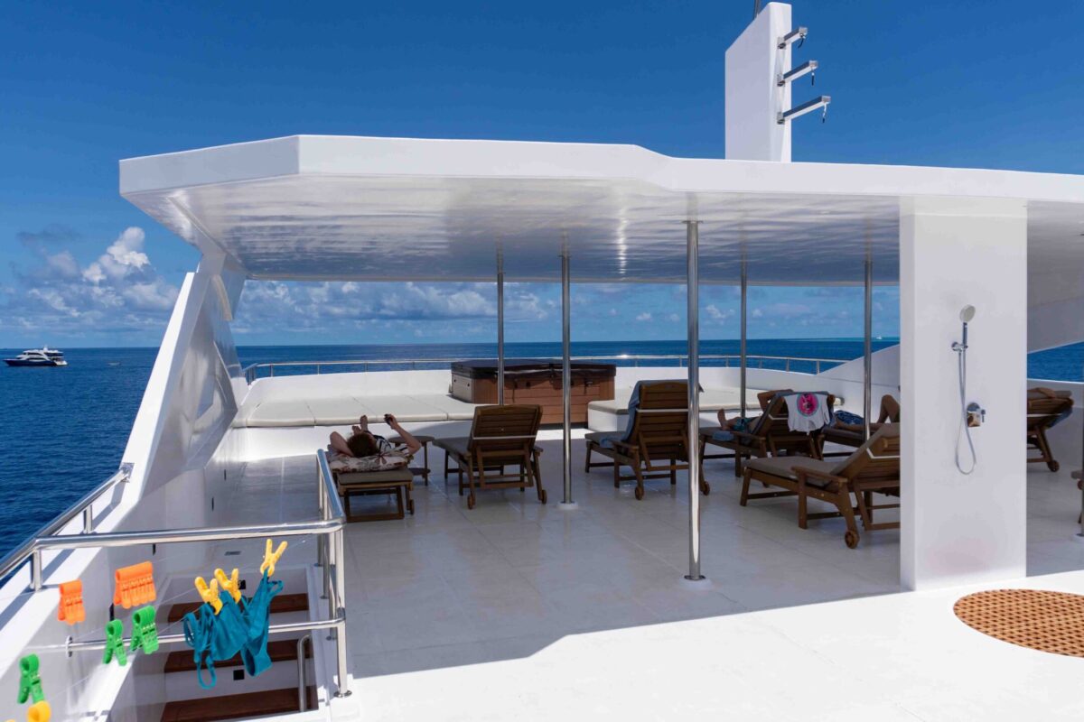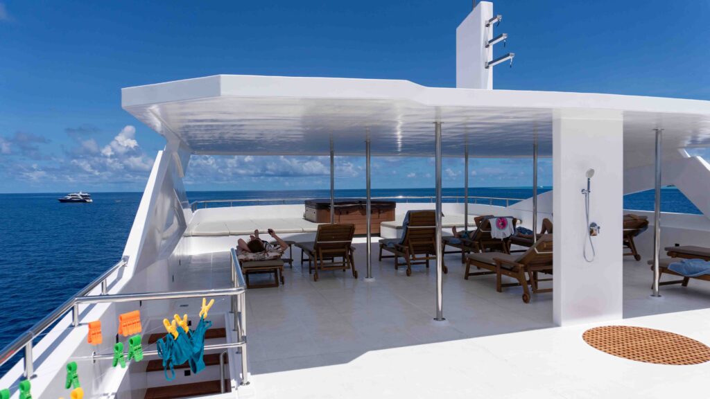 Die Princess Maani fährt seit November 2024 ist das Flaggschiff der First-Class‑Cruising‑Flotte – gebaut für lange, entspannte Tage zwischen aufregenden Tauchgängen. Auf dem Hauptdeck liegt das Restaurant mit großen Fenstern, davor und danach findest du viel Platz zum Chillen: eine gemütliche Lounge mit einer bestens ausgestatteten Bar sowie großzügige Außenbereiche zum Lesen, Plaudern und Sterne‑schauen. Auf dem Sonnendeck warten zwei Whirlpools, Sonnenliegen und Beanbags – perfekt für spektakuläre Sonnenuntergänge.